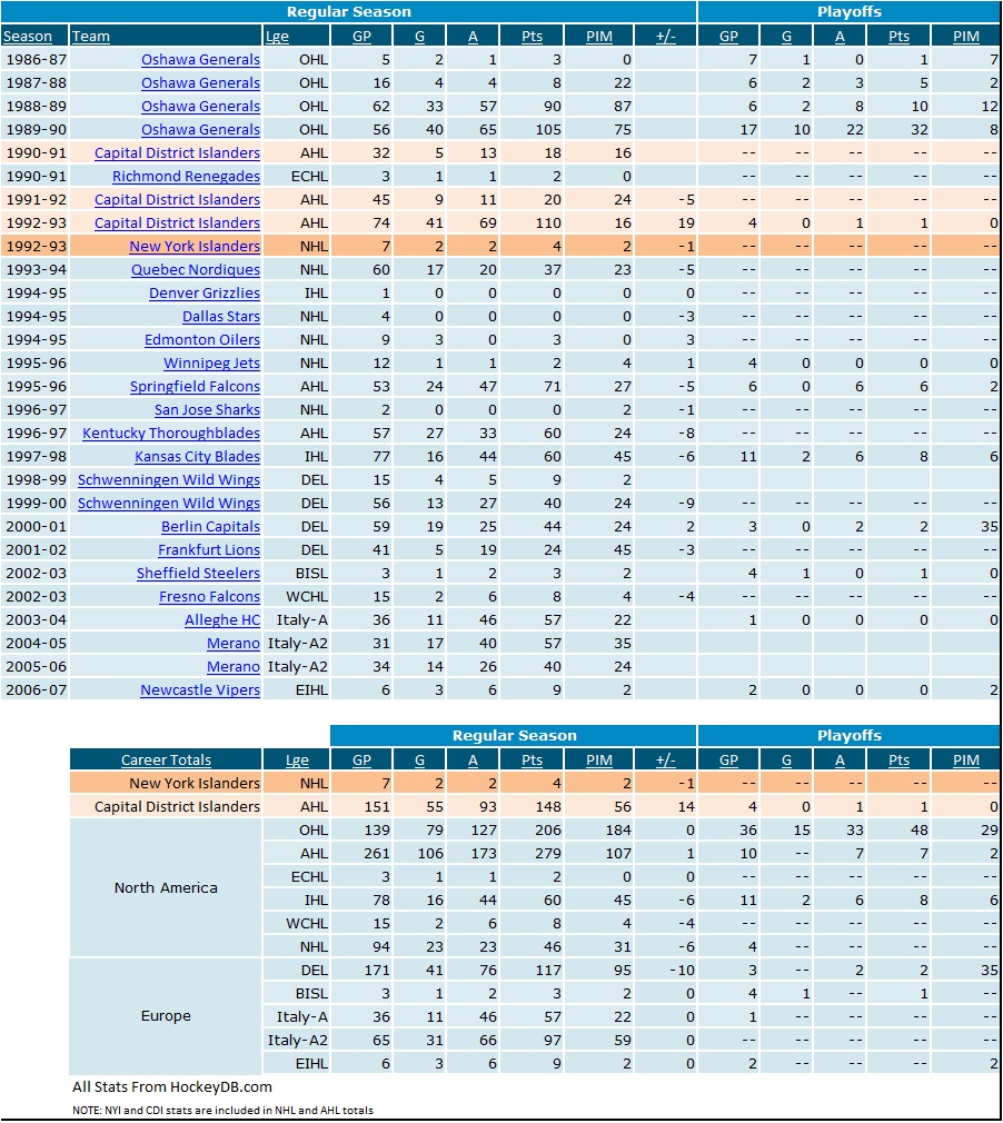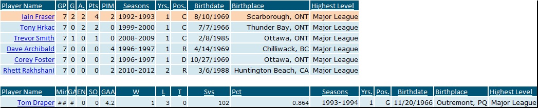 Armed with such promising stats the NY Islanders recalled Fraser late in the 1992-92 campaign. His stint in Nassau County lasted a mere 7 games as he registered 2-2-4Pts and 2PIM. He saw no time in the playoffs for the big Islanders that year. This statistical line places his atop the mountain of players who have appeared in precisely 7 games for the New York Islanders. Tom Draper is the only goaltender in this exclusive fraternity.